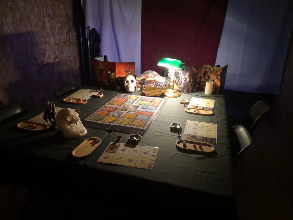 En voici quelques photos, l’occasion de vous dire qu’il est possible de faire ça chez vous (avec quelques éléments de décoration et un peu de lumière, ça le fait !), pour 4 joueurs (tarif Jeux en famille).